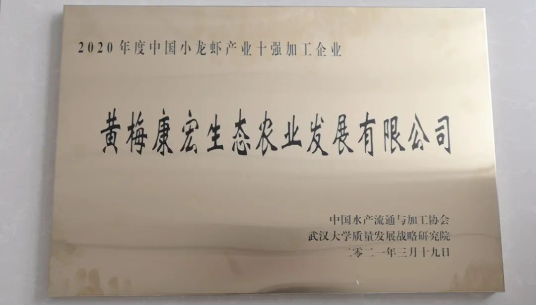 會上,湖北省糧油集團旗下黃梅康宏生態農業發展有限公司獲評2020年度中國小龍蝦產業十強加工企業。