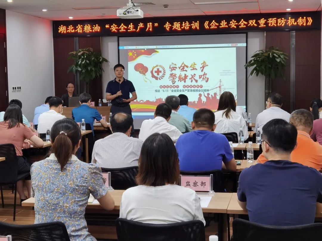 為全面提高集團安全生產意識,進一步貫徹“落實安全責任,推動安全發展”精神,統籌安排企業發展與安全生產關系,切實將安全生產責任入腦入心,見行見效,6月17日,湖北省糧油集團召開“安全生產月”專題培訓暨《企業安全雙重預防機制》講座,通過“請進來”的方式,特邀武漢市應急管理專家王秀群老師,針對風險識別、風險管控、隱患排查等方面從技術層面和操作層面進行全方位授課。