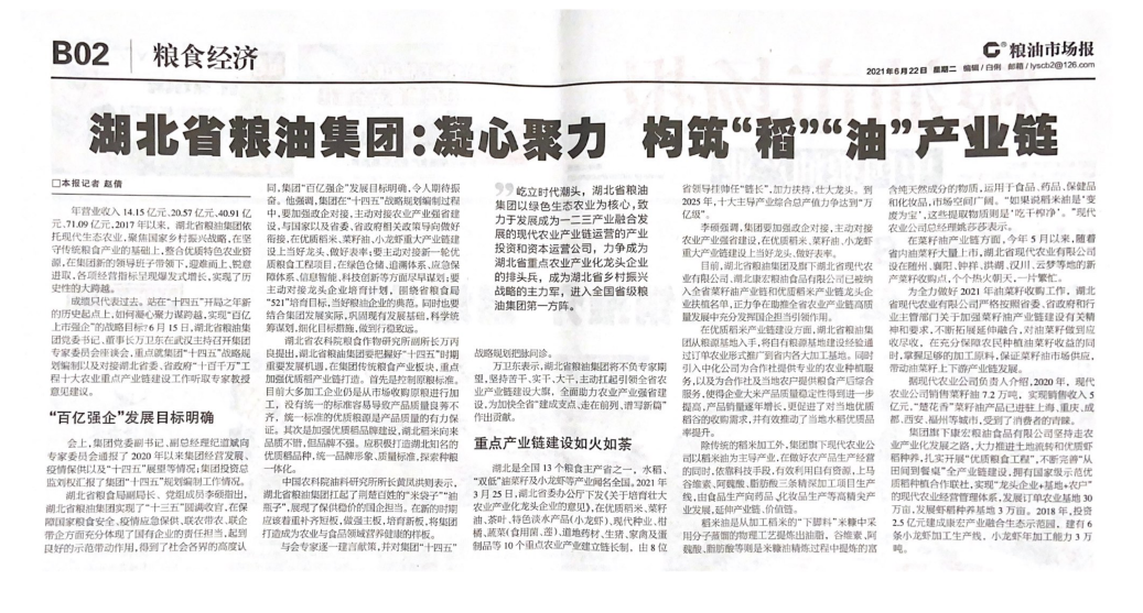 中國農科院油料研究所所長黃鳳洪則表示,湖北省糧油集團扛起了荊楚百姓的“米袋子”“油瓶子”,展現了保供穩價的國企擔當。在新的時期應該著重補齊短板,做強主板,培育新板,將集團打造成為農業與食品領域營養健康的樣板。